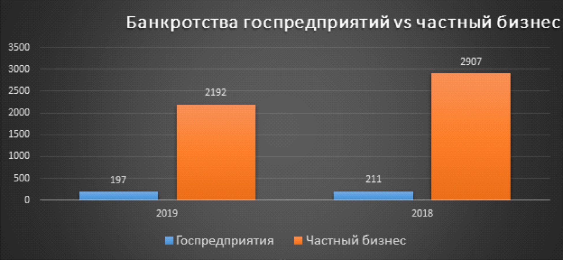 И в целом, уже который год не меняется соотношение цифр по банкротствам государственных организаций против частного бизнеса, в 2019 году оно выросло на 1 %.